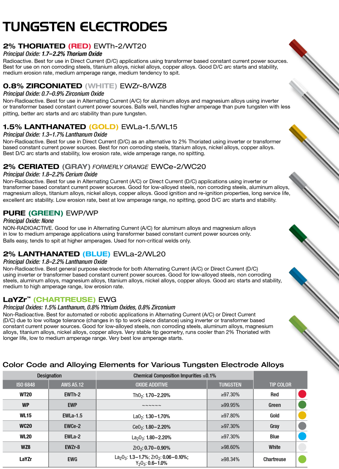 Best for automated or robotic applications in alternating current (A/C) or direct current (D/C) due to low voltage tolerance (changes in the tip to workpiece difference) using an inverter or transformer-based constant current power sources. good for low low alloyed steels, non-corroding steels, aluminium alloys, magnesium alloys, titanium alloys, nickel alloys, copper alloys. Very stable tip geometry runs cooler than 2% thoriated with longer life, low to medium amperage range. Very best low amperage starts.