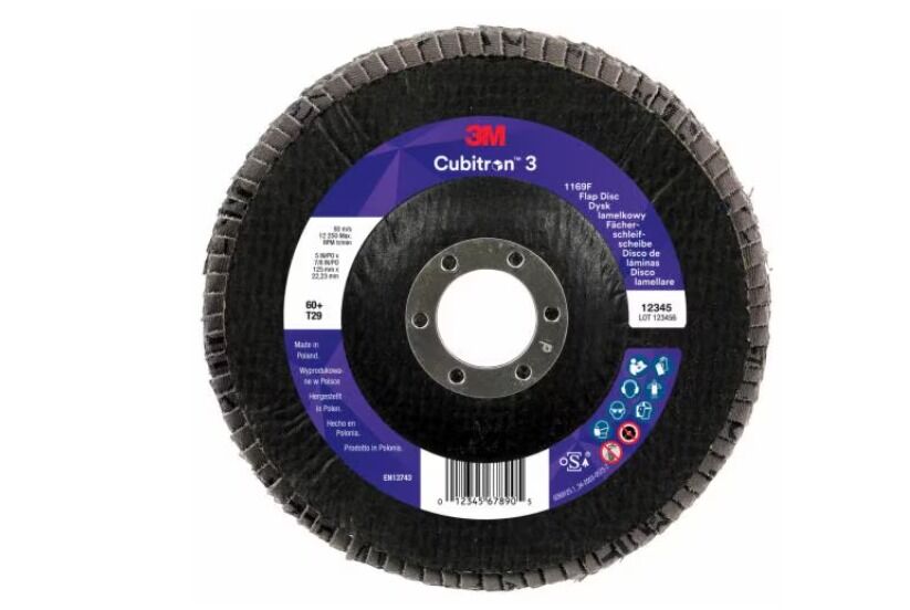 3M™ Cubitron™ 3 Flap Disc 1169F is one of our highest-performance abrasive disc built for versatility and value. Powered by 3M Precision-Shaped Grain re-engineered now with curved sides, it lasts longer and cuts faster than any other shape grain, conventional aluminum oxide, or alumina zirconia flap discs at the same time that it's easy -to-operate, offering the long life required in everyday use. This unbeatable combination of performance and value can increase productivity while also lowering your abrasive spend.