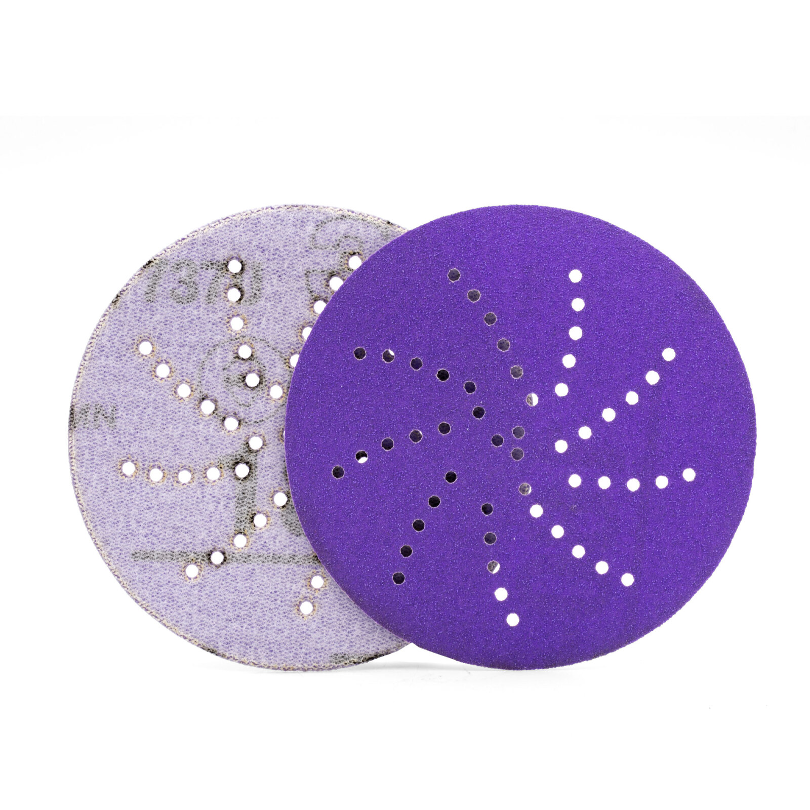 Shape rough body filler, remove paint and create fine feather-edging with 3M™ Cubitron™ II Hookit™ Purple+ Multihole Abrasive Disc 737U. Our triangular shaped grain and multi-hole pattern abrasive disc can also be used for the final prep before blending or priming. It gives a superior cut, 30% faster than other premium abrasives, and long disc life during key stages in auto body repair. The surface of the abrasive disc has our Precision-Shaped Grain technology. It’s made from sharp triangular shaped electrostatically oriented grains. Each grain works as an individual cutting tool to slice through paint and body filler. The multi-hole pattern on our abrasive disc offers excellent dust extraction increasing cut rate and disc life. The back of the abrasive disc has our Hookit™ technology. A hook-and-loop system for work spaces where adhesive backed discs may become spoiled by dust, dirt, or flying debris. Hookit™ sanding discs attach to a hook‐and‐loop backup disc pad (sold separately) on a random orbital sander, can be removed cleanly and easily, and can be re‐used again and again for the extent of the abrasive life.