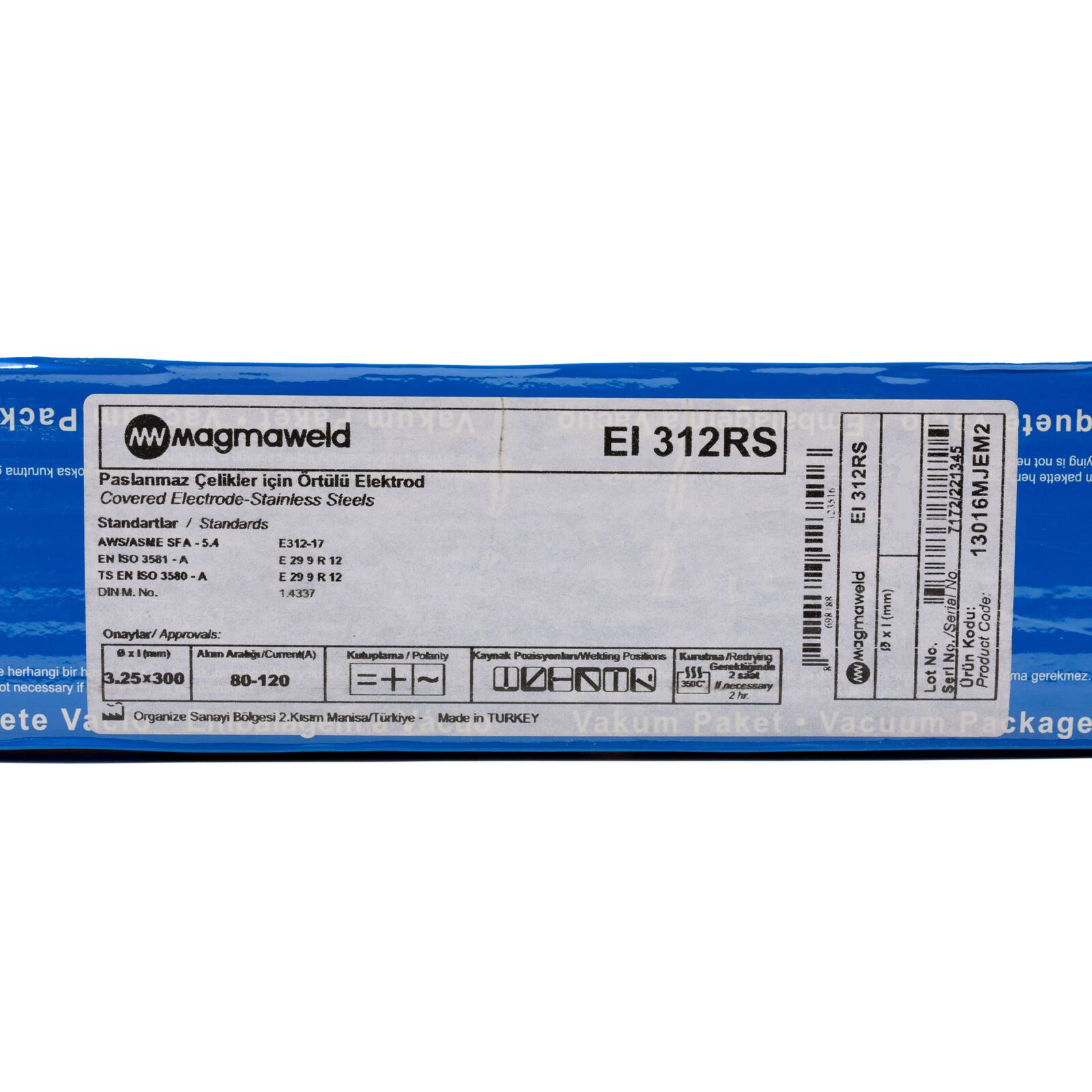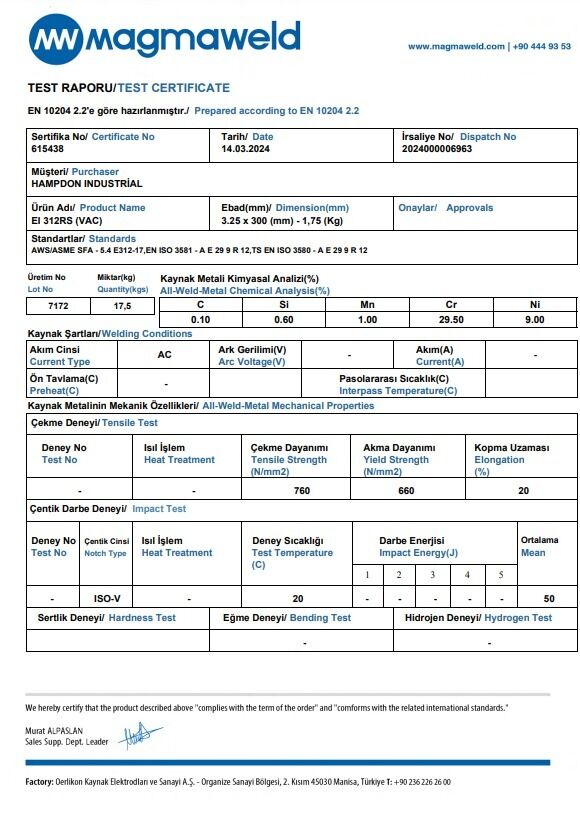 Hampdon Industrial stocks the premium range of Magmaweld Welding Electrodes. E312 Electrodes are known for welding of dissimilar metals such as stainless steel to mild steel and low alloy steel. This electrode is Excellent for repair welding and was especially developed for steels difficult to weld, such as armour plates, austenitic manganese steel and high carbon steels. Excellent weld ability and with self releasing slag that performs well on AC and DC+ polarity. Most importantly E312 has excellent crack resistibility.